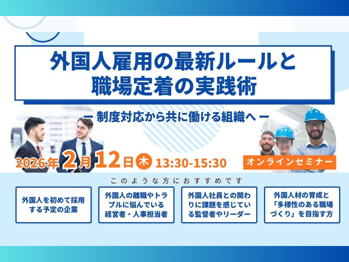 2/12(木)開催! ~『 外国人雇用の最新ルールと職場定着の実践術 オンラインセミナー』のご案内 ~ 近年、外国人材の受け入れは中小企業