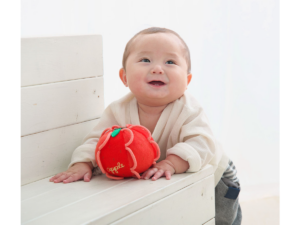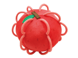 カラフルなフルーツをモチーフにした布製ボール。身の回りのものに興味が出てくる生後6か月頃は、まだ手の力が弱く、ものをつかんで遊ぶのは難しい時期。赤ちゃんに芽生えた好奇心の芽を健やかに伸ばしていくために、柔らかい紐のわっか(輪)を取り付け、赤ちゃんでも持ちやすいボールに。わっかの紐はST基準に準拠し、小さな子の指にひっかける最適で安全な長さにしています。振ると優しい鈴の音が。洗濯可能なので定期的なお洗濯で清潔に保つことができます。(全6種)