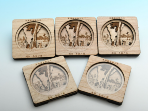 ①“手元に歴史を”のコンセプトを元に、「浜松城」と「東海道五十三次」の景色をコースターの中に再現しました。※五十三次の他絵柄は、順次発売予定。