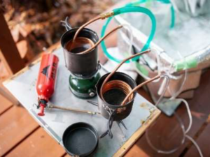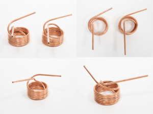 今回販売するのは銅管をコイル状に成型した熱交換器2 個または3 個とそれらを繋ぐ異径ソケットのセット。これに普段キャンプに使用する鍋やコンロ、風呂ポンプを組み合わせるだけ容易に追炊きと保温ができ、いつでもどこでも気軽に入浴を可能にするものです。