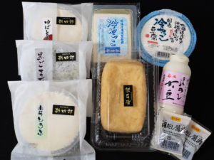 勘四郎ではさまざまな豆腐製品を取り扱っています。北海道産の大豆を100%使用した「勘四郎冷やっこ豆腐」、黒ごまを練り込んだ「黒ごま豆腐」、豆腐成分がぎっしり詰まった厚い油揚げ「国産手揚げ」など。そんな数ある商品の中からスタッフが厳選した7商品をセットにしました。1週間、毎日ちがう豆腐製品がたのしめます。