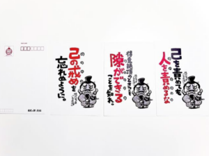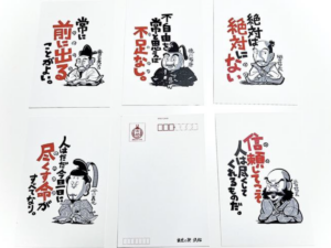 戦国名言スタンドと徳川しかみ像戒めスタンドのデザインで作った絵葉書。