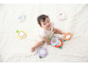 小さな子どもの手でも掴みやすい“わっか”は、指に引っ掛けて偶然持つことから始まり、発育に合わせて、意図してつかむ、振る、離す、というように動作も変化していきます。早い段階から指先の感覚を刺激することで、赤ちゃんの発達を促します。