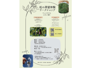 伸松園で生産する黒松の仕立物の剪定枝をアロマの原料として活用し、蒸留してエッセンシャルオイルを抽出します。その後、松のオイルと他の香りも自由に組み合わせ、オリジナルのブレンドオイル(スプレー)を製作するイベントです。