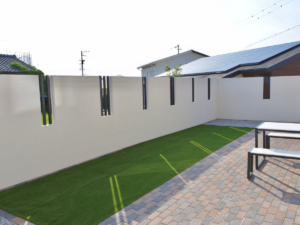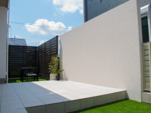 それに比べてグランドアートウォールは最大の高さが3m 、控え壁は高さに関係なく必要ありません。そのため、外からの視線はほぼ完全にシャットアウト、控え壁もなく広々としたプライベート空間を活用できます。外部との空間を完全にシャットアウトするのは不安という方も、スリットや窓・ドア・照明の差し込みが可能ですので、打ち合わせの際にご相談ください。