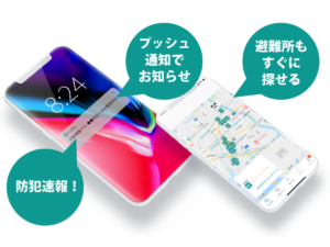 災害時や防犯情報も、「川沿いにいる方だけ」や「駅前にいる方のみ」に別々の情報をプッシュ通知で知ることができます。子供や高齢者が家族にSOSを送れたり、位置情報を把握するシステムも備えています。