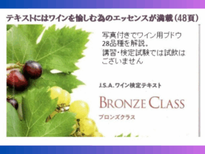 ワイン検定ブロンズクラスは日本ソムリエ協会がワインの普及のために主催しており、入門編としてご家庭でワインを楽しく飲んでいただける知識を習得するものです。申し込んでいただくと豊富な写真やイラストを盛り込んだ日本ソムリエ協会で特別に編纂されたテキストが届きます。