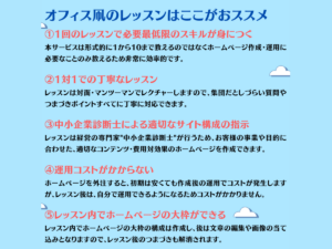 このサービスは、 HP を作成することが目的ではなく、 お客様自身が HP を作成できるようにすること を目的としています。 自身で HP を作成 できるようになると、 運用コストがかからない、サイトの更新・編集がスピーディに対応可能、自分のイメージ通りの変更ができる、等多くのメリットがあります。また、レッスン内では実際のお客様用のホームページを作成しながらレクチャーしますので、レッスン終了時点でホームページの大枠が完成されている状態となります。