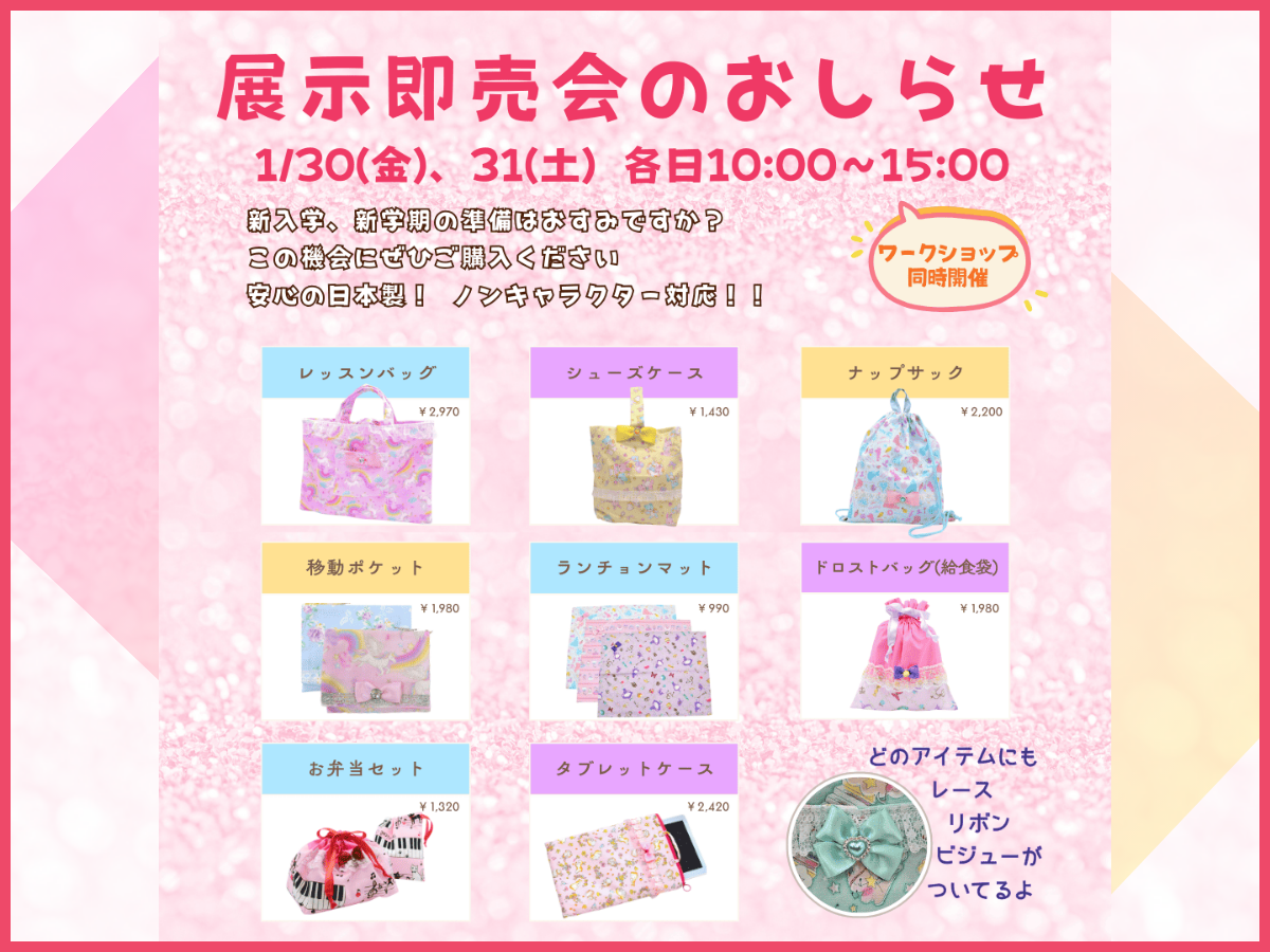 浜松市中央区(旧東区)大瀬町の株式会社はなか本社で学童用品の展示即売会を行います。 きらきらビジューやレース、リボンを使ったオリジナルのグッズがたくさん